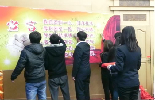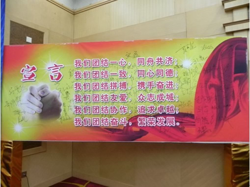会议最后,所有受聘人员就职宣誓:“我们团结一心,同舟共济;我们团结一致,同心同德;我们团结拼搏,携手奋进;我们团结友爱,众志成城;我们团结协作,追求卓越;我们团结奋斗,繁荣发展。” 在他们的带动下,唐山康鑫公司全体员工都在写有宣言的旗帜上签下了自己的名字。在团结和谐的气氛中,唐山康鑫公司2012年度工作会议胜利闭幕。